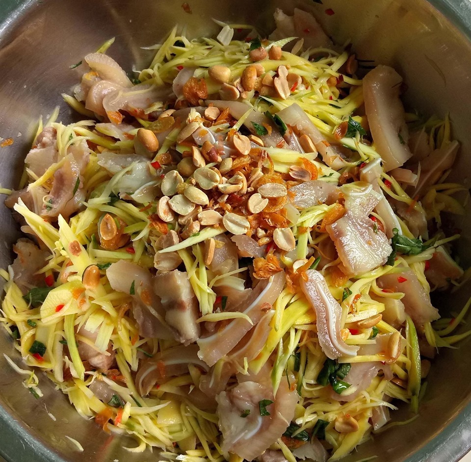 Một trong những món ăn rất ngon và được nhiều người yêu thích được chế biến từ thịt má heo đó chính là nộm thịt má heo. Thịt vừa mềm vừa giòn lại có độ nạc và mỡ xen kẽ, trộn đều với các gia vị giàu tinh dầu và một vài loại hoa quả như xoài hoặc đu đủ sẽ trở nên hấp dẫn khó mà cưỡng lại được